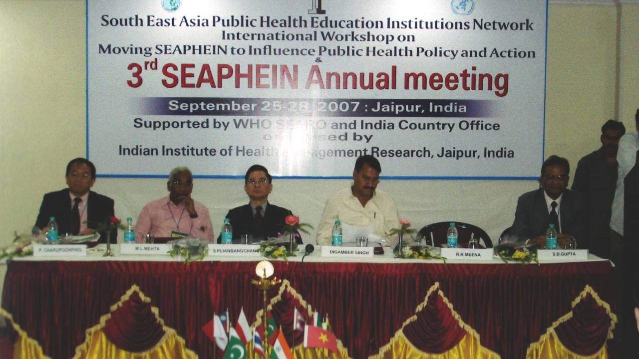 The 3rd SEAPHEIN Annual Meeting and International Workshop on ‘Moving SEAPHEIN to Influence Public Health Policy and Action’ was organized at the Indian Institute of Health Management Research, Jaipur, India during September 25 – 28, 2007, with support of the WHO SEARO, New Delhi, and WHO India Country Office. The main purpose of the 3rd Annual SEAPHEIN meeting was to provide continuum to the efforts, to promote and strengthen, and improve quality of public health education and training through developing a collaborative network of public health education institutions in South-East Asia Region, as a part of Public Health Initiative launched by the WHO SEARO under leadership of the Regional Director, Dr. Samlee Plianbangchang. The theme of the meeting was focused on SEAPHEIN’s role in influencing Public Health Policy and Action in the member countries.